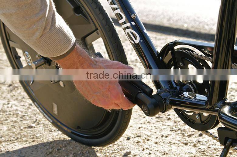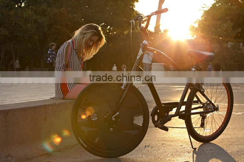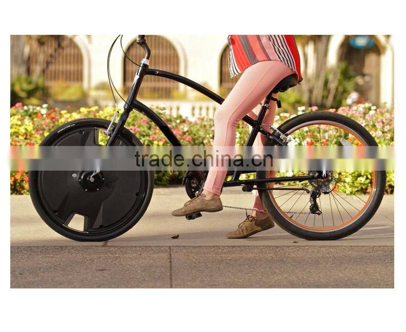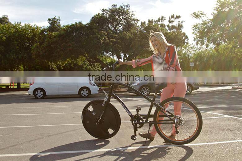 The Electron Wheel™ consists of a high powered, self-contained electric motor that’s integrated into a standard 24”, 26” or 700c wheel,and can be easily fitted onto a standard bike frame within 30 seconds, without the need for specialized tools or equipment.