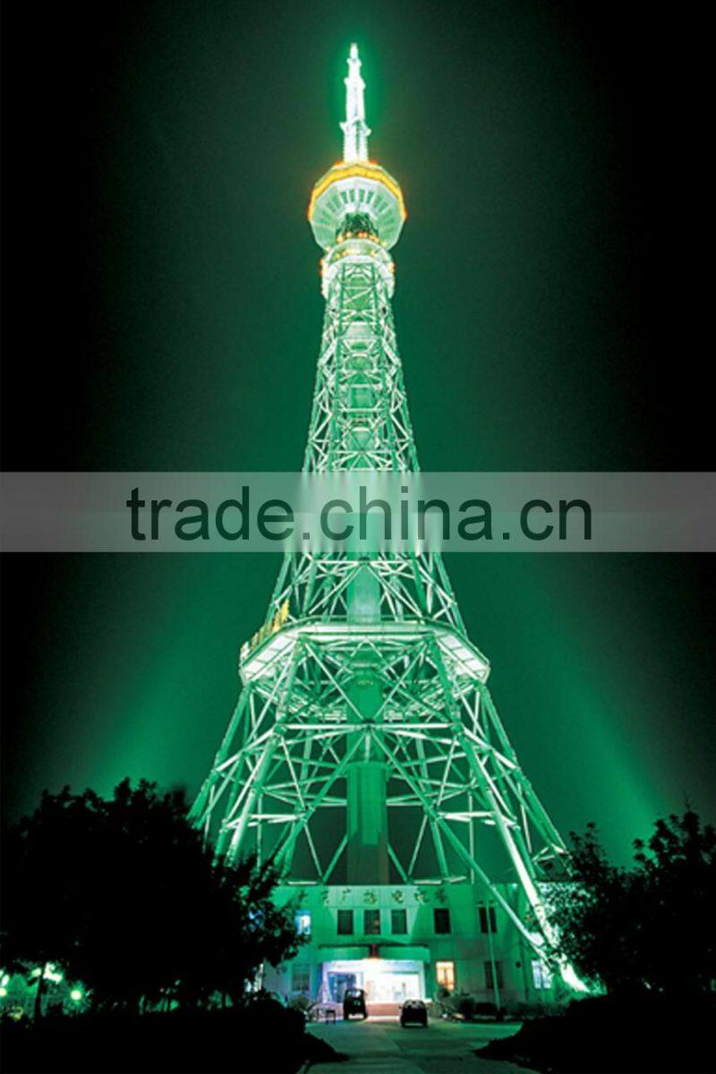 TV towers are, typically, tall structures designed to support antennas for television. They are among the tallest man-made structures. TV tower mainly consist by tower foundation, body, ladder, antenna and other accessories. Some TV tower belong to self-support tower type, some Possessing an antenna attached to the tower's pinnacle, which in turn, is guyed on a horizontal cross (4 cross-like steel arms) fixed on the main body of the tower, TV Tower is mainly used for transmitting FM-/TV-broadcasting, at the same time, for mobile and/or other means of telecommunication. In the case of a mast radiator or radiating tower, the whole mast or tower is itself the transmitting antenna.