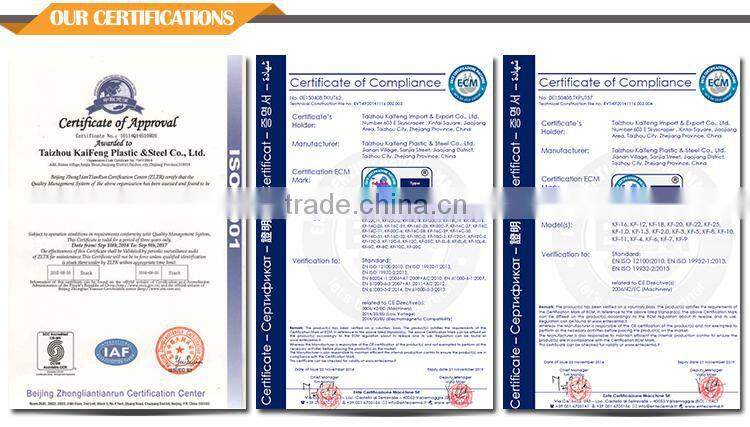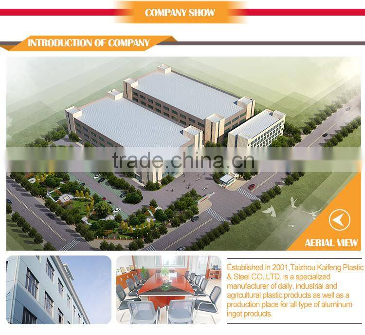 Established in 2001, Taizhou Kaifeng Plastic & Steel Co., Ltd. is a specialized manufacturer of daily, industrial and agricultural plastic products as well as a production place for all type of aluminum ingot products.Through several years of development, now we have 30 sets all kinds of injection molding plastic machines and blow plastic machine, of which the injection capability ranges from 100g to 3,000g. After as tructural policy of introducing the most advanced technology both at home and abroad, we now have a strong development capability. We have the most prevailing CAD/CAM mold designing systems and we house the best engineer who are following the latest plasitc products and articles information, Therefore, we have been developing and producing new products for our customers constantly. Our main products include all kinds of sprayers, plastic stools, chairs, turnover cases, beer cases, fish cases, plastic barrels and etc. , And the sprayers have gained the CCC&CE cetification. Please refer to our website for more details and examples. With the expanding business, we estabished Taizhou Kaifeng Import & Export Co.,Ltd later. We adhere to the principle of "quality means market, prestige wins customer", and supply high quality products, good after-sales service and prompt delivery. Therefore, we have been enjoying a great reputation in more than 20 countries around the world. We are looking forward to forming business relationships with you in the near future.