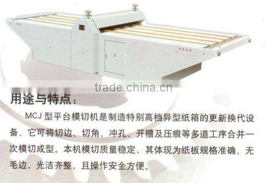 The MQJ series of platform mould slicing machine is the renew equipment to make the special upscale unusual carton which can slice the side,slice the corner,hurtle the bore,open the slot,press the trace and other processes.It can make all the above-mentioned processes into one integral whole process and merge once mould cutting into the type.The quality of slicing the mould is stable,the size is accurate,the side is bairless.It is clean and tidy and can be operated safely and conveniently.