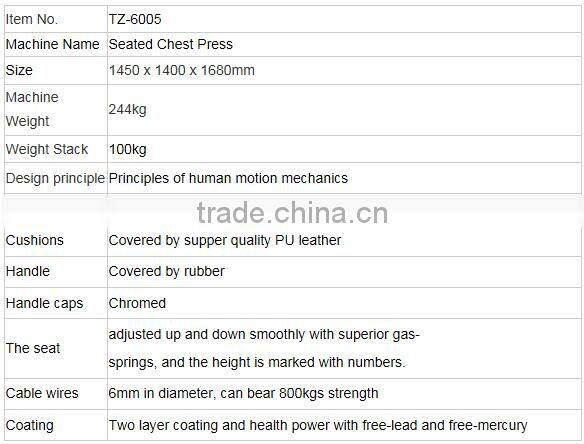 TZ-6005 Seated Chest Press is Pin loaded fitness equipment / gym equipment,with high quality steel tube Q235 with 60 x 120 x 3mm,perfect welding and super quality PU leater,with 6mm diameter strong cable and