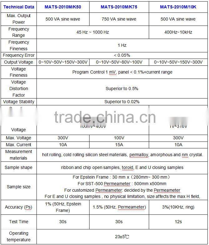 MATS2010M applies to measure the magnetic properties of silicon electric sheet: Ps, Jm, Hm, Ss and AC magnetizing curve and losses curve. It can also meet the special test requests: silicon steel, permalloy, amorphous alloy and nanocrystalline under 45Hz~1kHz or under 5kHz, and can also test over-shaped cores and applies to production line.