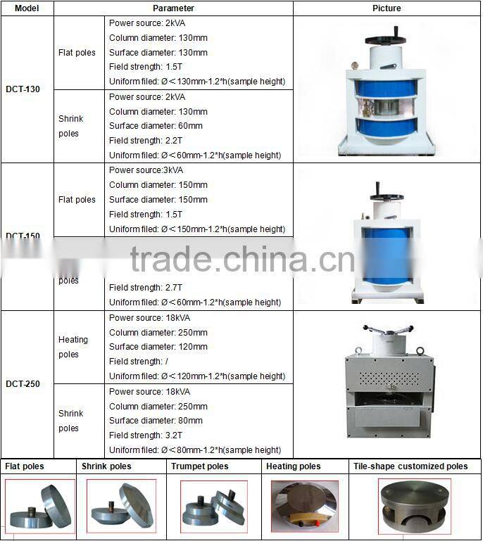 Automatic measurement of the demagnetization curve of permanent magnetic material such as ferrite, AlNiCo, NdFeB, SmCo, etc. Accurate measurement of the magnetic characteristic parameters of remanence Br,coercive force HcB, intrinsic coercive force HcJ and maximum magnetic energy product (BH)max.