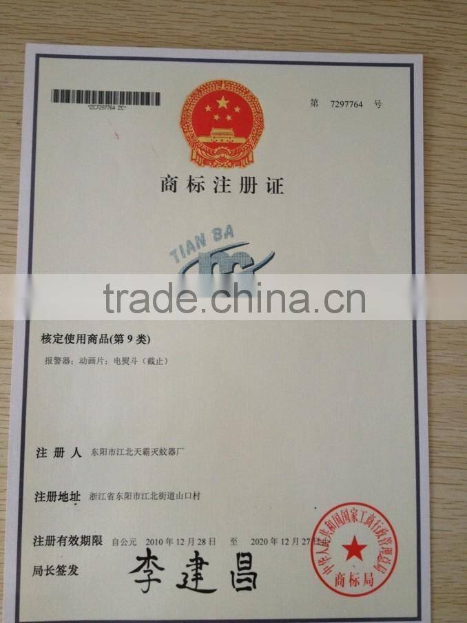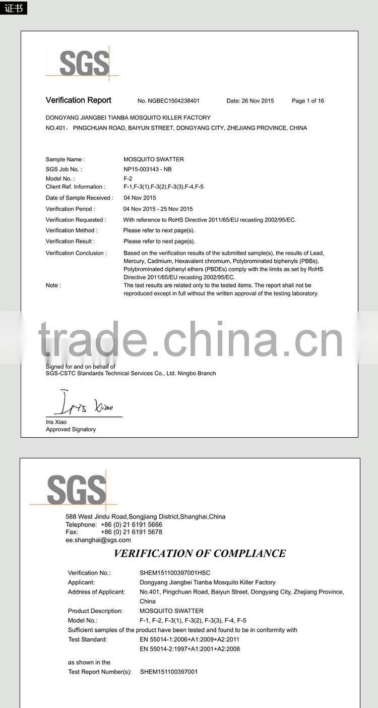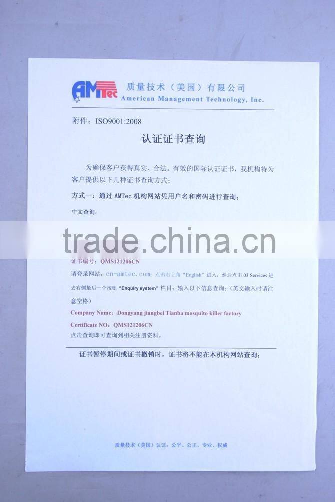 Dongyang Jiangbei Tianba Mosquito Swatter Factory Was the Subordinate Factory of Dongyang Hangxiao Electrical Appliance Co.,Ltd. It already Through ISO9001-2008 Quality Management System tandard.The production also With CE and RoHS certification.