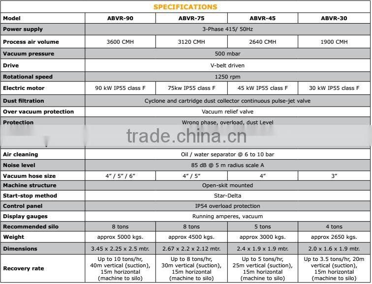 The VRS is of strong construction with sturdy maintenance access doors and contains the filter section fittered wit safety relief value and automize sequenced reverse pulsejet and filter cleaning machine system,motor compartment housing an electric drive motor and a vacuum pump compelet with exhaust silencer.this unit is also fitter with an electrics control panel.