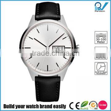 Brushed PVD steel stainless steel case watch waterproof 5ATM Date and Day function movement black nappa leather