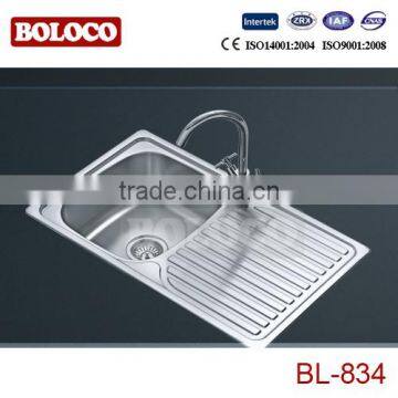Single bowl on drainer water sink for Australia BL-834 design is simple and elegant. Its perfect flatness and practicality, can be called a masterpiece of art. Complied with the automatic waste design, easy top mounted installation. From the international master's elaborate design, this series sink all adopt automatic waste design. Smooth shining countertop processing and high flatness can bring your diverse kitchen experience. Welding series owns simple design, super practicability and smooth fine surface treatment. As a design of tide of fashion, it is very convenient to daily clean because of complete fittings, efficient operation and the special material. In line with strives for perfection the spirit, all the products are demanding perfection. Welcome to telephone to inquire and order, we will do our best to make you satisfied.