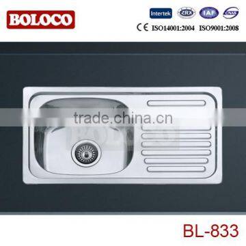 SINGLE BOWL ONE DRAINER SINKS BL-833 design is simple and elegant. Its perfect flatness and practicality, can be called a masterpiece of art. Complied with the automatic waste design, easy top mounted installation. From the international master's elaborate design, this series sink all adopt automatic waste design. Smooth shining countertop processing and high flatness can bring your diverse kitchen experience. Welding series owns simple design, super practicability and smooth fine surface treatment. As a design of tide of fashion, it is very convenient to daily clean because of complete fittings, efficient operation and the special material. In line with strives for perfection the spirit, all the products are demanding perfection. Welcome to telephone to inquire and order, we will do our best to make you satisfied.