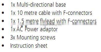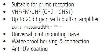 We manufacture high frequency wireless network transceiver products, covering indoor and outdoor TV antennas,, outdoor UHF ANTENNAS, outdoor aerials, UHF/VHF/FM antenna, Antenne extérieur, indoor antenne, Zimmerantenne Antenne, AMPLIFICADOR ANTENA INTERIOR,amolificador,Yagi antenna, amplifiers, Satellite Dishes and equipments, Splitters, wireless AV senders, AV selectors, DVB-T, DAB and LED spotlight products.