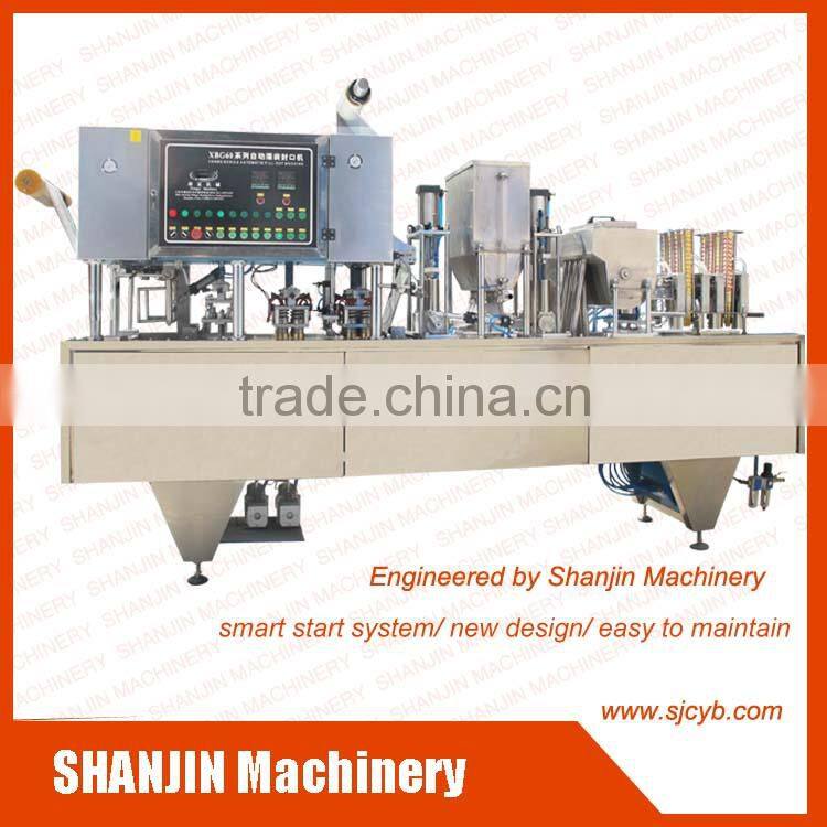 Many Outputs (100-20000cph) Our SBG-60 series filling sealing machine can offer many output. You can choose freely! | Complete function You can have the functions you need without any problemsAdvanced pneumatic control system, fill precisely and seal cups perfectly. | Accurate filling No matter what kind of materials can accurate cans,precisely fill without splash,table and reliale.