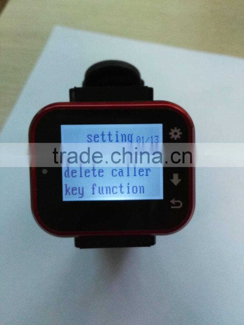 vibrating wrist watch with watch pagers is widely used in service area. It consist of table button for guest use and signal receiver for waiter or waitress use. When the guest needs any service, he or she just press the button near him or her, his or her desk number will showing on the RECEIVER with alert music or sound. So the waiters could offer service very timely.