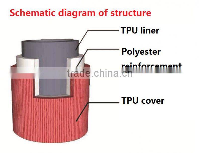 Large high pressure TPU hose is the company’s core product ,and it is a kind of lay-flat water and oil discharge hose(antistastic and inflamble ) .it consists of TPU liner ,polyester reinforcement and TPU cover.Their Nominal diameter, from DN25 to DN350,Working pressure ranges from 150PSI to 450PSI,and length ranges from 20m to 200m.It has the features of bearing high pressure,durable,Corrosion resistance, aging resistance,and transfers for water,oil , gas and other mediums.This hose produced by green and environmental materials ,and not polluting the transfer mediums,used for shale gas exploitation,coal mines,fuel and oil industries,water discharge,agriculture irrigations ,flood and fire disasters and so on.