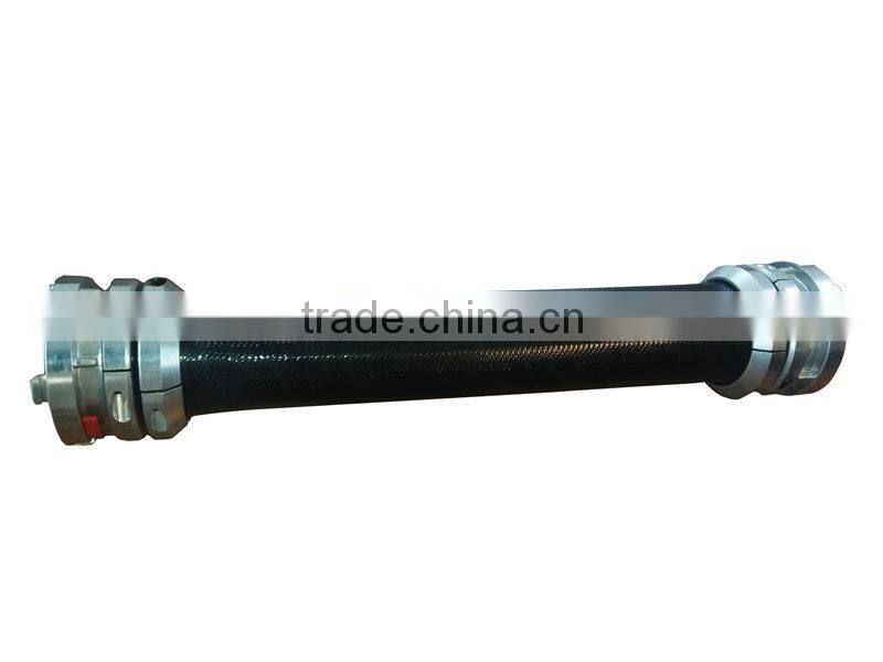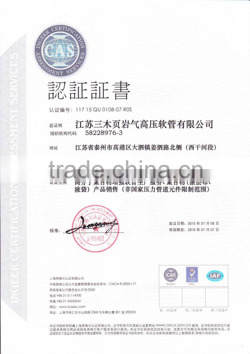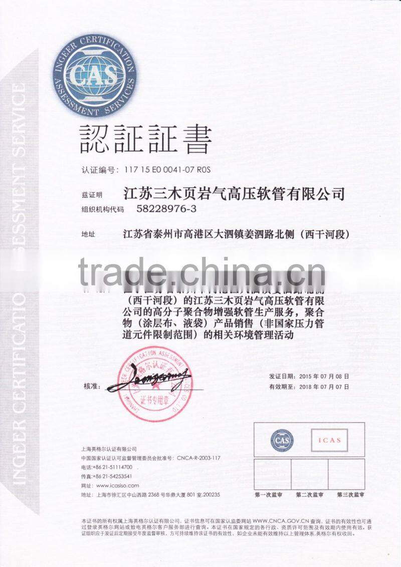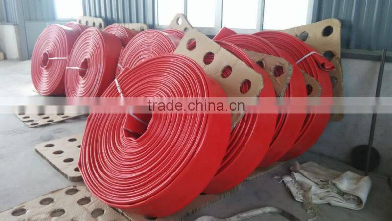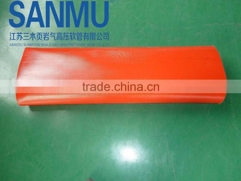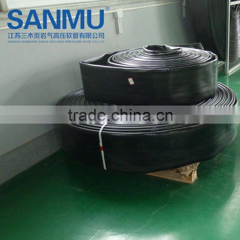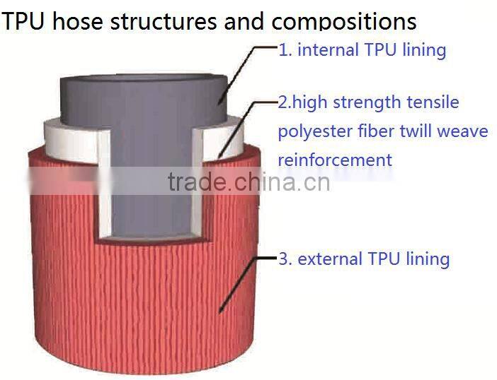 High pressure TPU hose is the company’s core product ,and it is a kind of lay-flat water and oil discharge hose(antistastic and inflamble ) .it consists of TPU liner ,polyester reinforcement and TPU cover.Their Nominal diameter, from DN25 to DN350,Working pressure ranges from 150PSI to 450PSI,and length ranges from 20m to 200m.It has the features of bearing high pressure,durable,Corrosion resistance, aging resistance,and transfers for water,oil , gas and other mediums.This hose produced by green and environmental materials ,and not polluting the transfer mediums,used for shale gas exploitation,coal mines,fuel and oil industries,water discharge,agriculture irrigations ,flood and fire disasters ,etc.