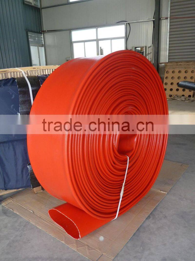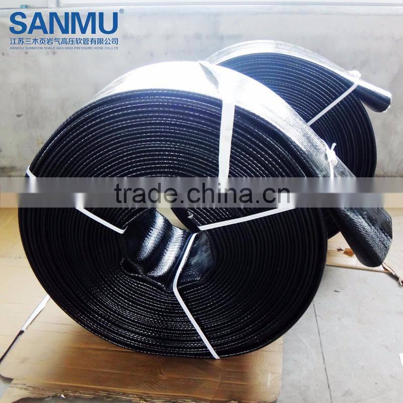 High pressure TPU hose is the company’s core product ,and it is a kind of lay-flat water and oil discharge hose(antistastic and inflamble ) .it consists of TPU liner ,polyester reinforcement and TPU cover.Their Nominal diameter, from DN25 to DN350,Working pressure ranges from 150PSI to 450PSI,and length ranges from 20m to 200m.It has the features of bearing high pressure,durable,Corrosion resistance, aging resistance,and transfers for water,oil , gas and other mediums.This hose produced by green and environmental materials ,and not polluting the transfer mediums,used for shale gas exploitation,coal mines,fuel and oil industries,water discharge,agriculture irrigations ,flood and fire disasters ,etc.