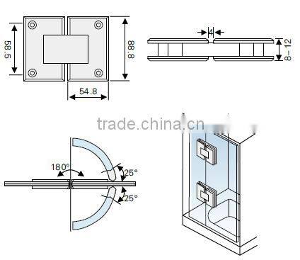 180 degree square glass to galss bathroom shower hinge/ High quality zinc alloy stainless steel glass door clamp(WL-8103)