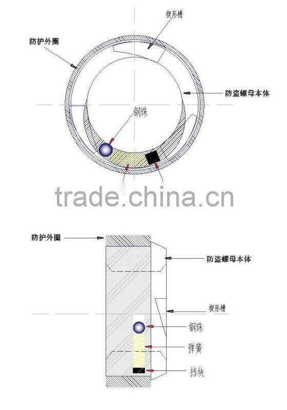 with Spring and Balls is a kind of product which company combines numerous product feature of anti-theft nut in existence, through continuous improvement , search and developes new-style anti-theft nut. This product has received national utility model patent, the patent number is ZL200720090142.7, the main specifications are QLCN3-16, QLCN3-18, QLCN-20, QLCN3-22, QLCN3-24. The product can wide applicate to anti-theft fasteners or components in the field facilities such as electric power system, correspondence system and highway. It is a good anti-theft function, convenient installation and low cost anti-theft nut, and the nut also can be made according the demands of customer.