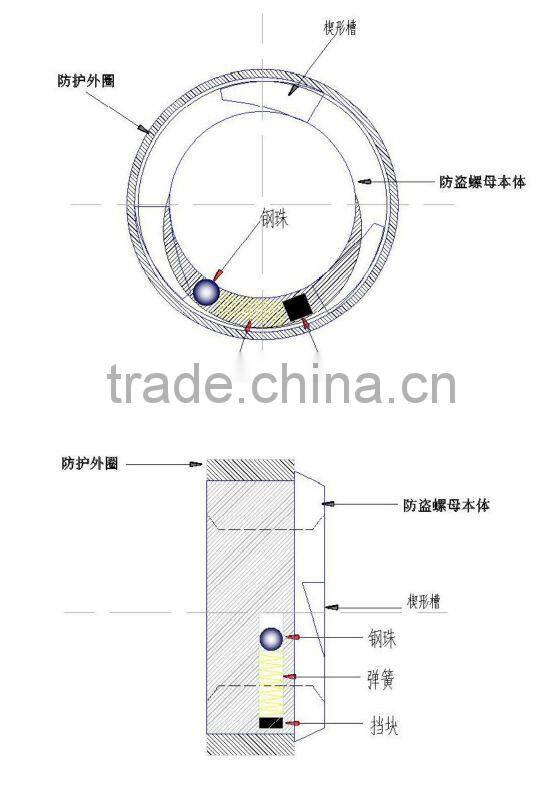 feature of anti-theft nut in existence, through continuous improvement , search and developes new-style anti-theft nut. This product has received national utility model patent, the patent number is ZL200720090142.7, the
