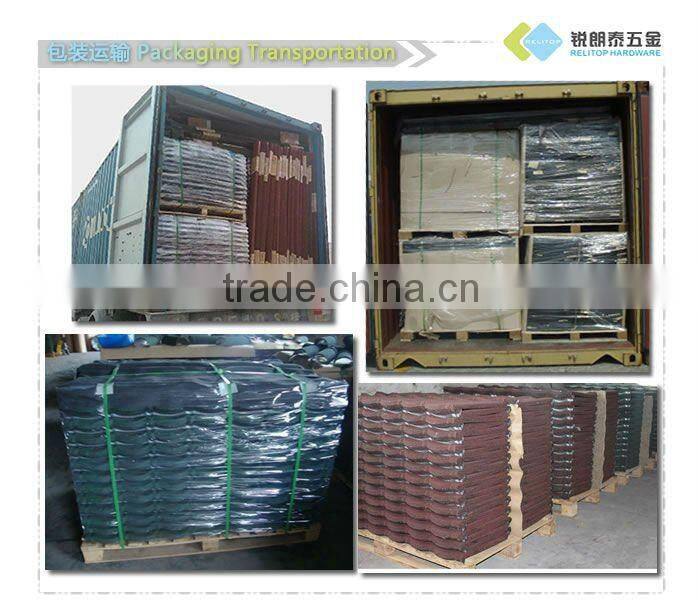 stone coated metal roof tile is based on Al-Zn steel.the before,after protective film treatment ensure to be the best roof .Color stone coated metal roof tiles is based on Al-Zn(known as zincalume or galvalume steel)steel.the before and after protective film treatment,together with high precision pressure-shaped gravel ensure the roof to be the best roofing ated with an alloy composed of Al 55%,Zn 43.4%,Si 1.6%,with non-toxic acrylic adhesive and natural stone,color stone coated metal roof provides the advantages of long life,strength,durability and beauty.
