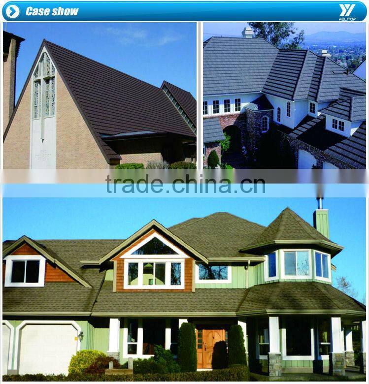 Coated with an alloy composed of Al 55 % , Zn 43.4 % , Si 1.6 %, with Nontoxic acrylic adhesive and natural stone , Colorful stone coated metal roofing tile provides the advantages of long life, strength , durability and beauty.