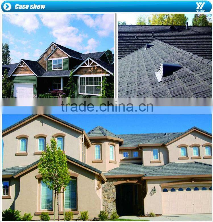 Coated with an alloy composed of Al 55 % , Zn 43.4 % , Si 1.6 %, with Nontoxic acrylic adhesive and natural stone , Colorful stone coated metal roofing tile provides the advantages of long life, strength , durability and beauty.