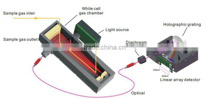 Ultraviolet light is sent by the light source through the optical window into white cell gas chamber (optical path 5-15 meters, adjustable) ;absorbed by the sample gas through the gas chamber. The light carrying sample