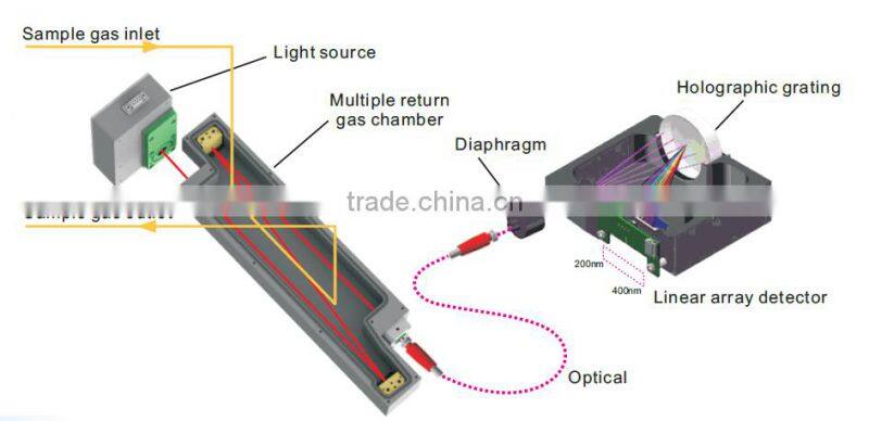 Ultraviolet light is sent by the light source through the optical window into gas chamber ( optical path 1 meters ) ; absorbed by the sample gas through the gas chamber. The light carrying sample absorption information gathers through lens coupled into fiber and then transmits through the optical fiber into spectrometer. After light splitting