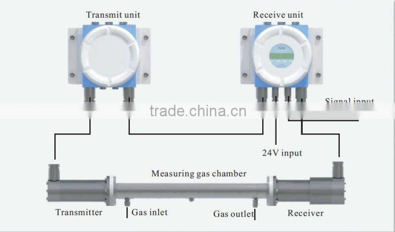LGT-106 laser gas analyzer consists of transmitter, receiver and gas cell. The transmitter drives the tunable diode to emit laser of certain wavelengths, which passes through the gas cell, then reaches the receiver. The receiver performs signal processing to obtain second harmonic signal, then calculates the concentration according to the relationship between the second harmonic signal and the gas concentration.