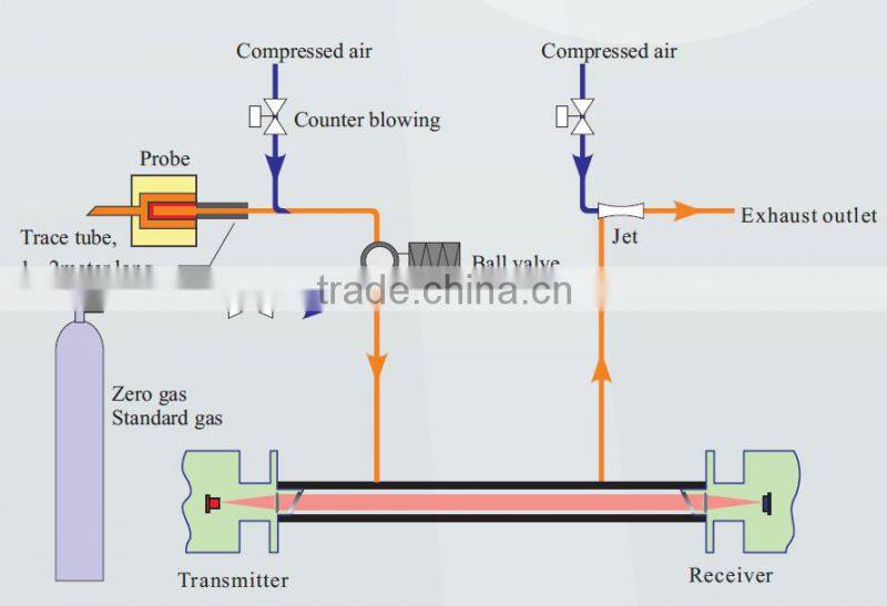 Extracted by a jet pump, the sample gas is filtered(get rid of dust), heated(avoid condensation), cooled(for high temperature condition), then reaches analyze module to be measured. Shutting off ball valve and analyze module, the analyzer carries out a calibration to ensure accuracy. Shutting off ball valve and opening back-flush valve ensures gas path unblocked.