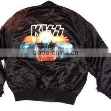 SATIN College Jacket Satin Sleeves (arms) (available in any custom colors) Satin Body (available in any custom colors) Nylon/cotton Matching knit collar, knit wrists & waist (available in any custom colors) Snaps front closure or zipper ((available in any custom colors) Diamond black color light quilted lining/padding. (Available in any custom colors and with different materials like, satin, jersey, Koran lining.