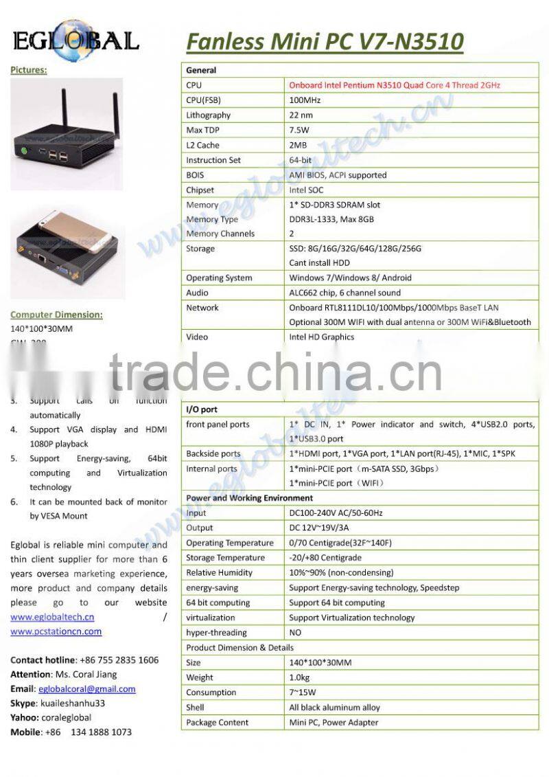 Baytrail Smallest Nettop PC V7-N3510 Intel Celeron 2GHz Quad Core Four Thread Palm Computer Fanless Mini PC