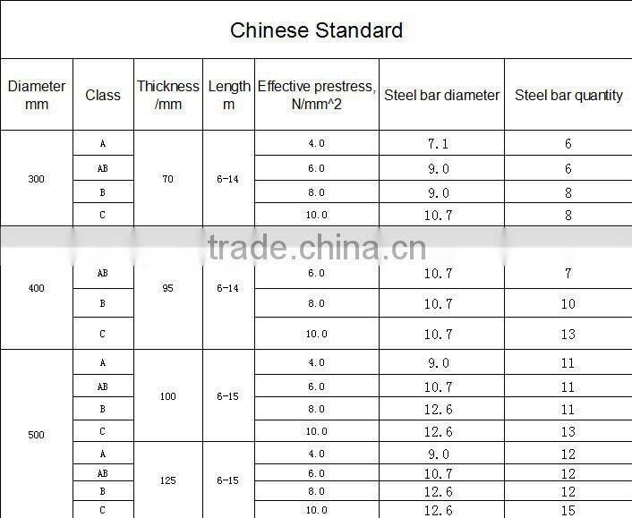 According to Concrete pile strength , there are PHC piles, and PC piles, According to different wall thickness, there are PC piles and PTC piles. Spun pile production line is used to produce High strength Cocrete piles. The popular specification of PHC piles are3 00mm ,400mm, 500mm, 600mm, 800mm and 1000mm, the length can be 7-15 meters, or we can design the mould according to your request.
