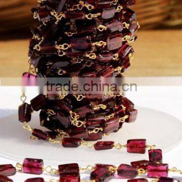 10 Feet Baguette Shape Garnet Rosary Style Beaded Chain, Gold Plated Wire Wrapped Chain, Handmade Beaded Chain, Linked Chain