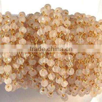 3 Feet Natural Rose Quartz Rosary Style Beaded Chain, Wire Wrapped Chain, Handmade Beaded Chain, Gold Plated Linked Chain,
