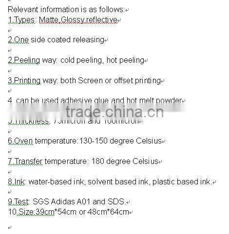 75micron glossy transfer pet film ,The surface is fog and antistatic treatment on the back. Smooth ,no crease,noparticles ,no bubbles ,no detachment,It is with the characteristics of high temperature resistance,good adhesive force of ink and stable release.