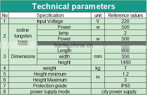 2. 3 section elevator frame, Maximum height of 2.8m, lamp can be adjusted up and down ,left and right, independently irradiation angle. lighting covering a radius of 35-55 meters.