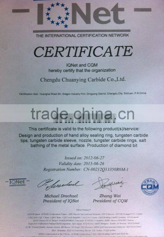 Chengdu Chuanying Carbide Co.,Ltd is a comprehensive hi-tech enterprise specializing in the research, manufacture and trade of tungsten carbide products and diamond bit. The company, with a field of 80 acres and advanced technology, has a strong capability in independent development, manufacture and trade. The engineers and technicians account for more than 30% of total staffs. Bringing in foreign advanced equipment, our workshops have equipped more than 100 advanced tungsten carbide manufacturing equipment such as milling, grinding machine, press sintering equipment, CNC lathes and so on