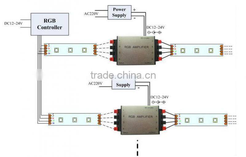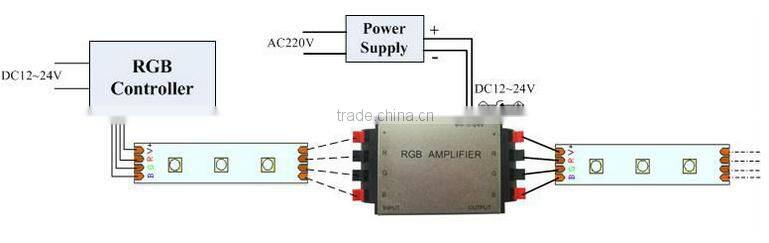 This RGB amplifier is suitable for all kinds of constant voltage led RGB controller. it can enlarge the led controller single through the RGB to receive the PWM(pulse width modulation),and output the single to the load ,then it can make the same effect with the controller.when add each additional amplifier, can connect and controlled twice more LED lights.theoretically , one controller can connector with thousands of this RGB amplifier, and can make the same effect.