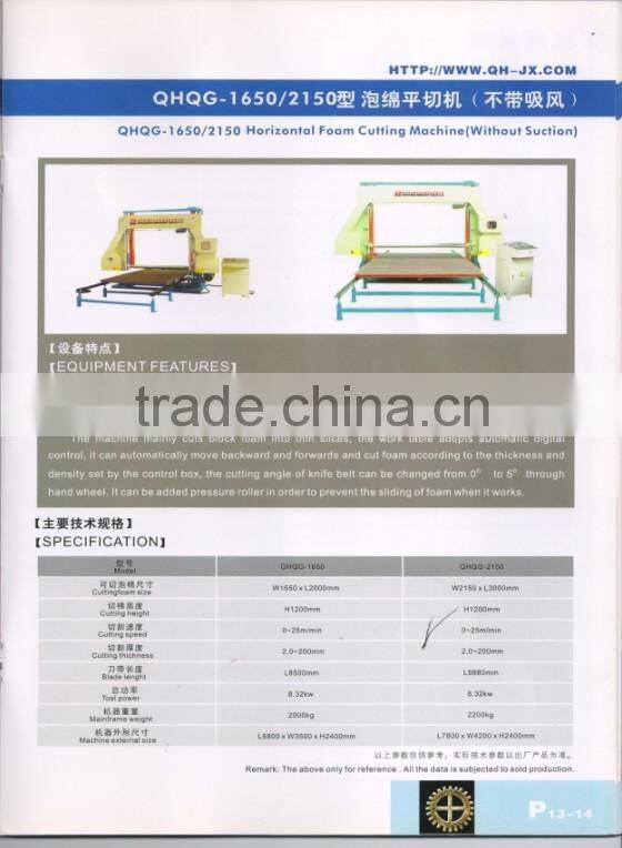 This cutting machine is mainly used for cutting block foam into thin slices, it adopts automatic digital control and automatically move backwards and forwards. This machine can cut foams according to the thickness and density set by the control box; the cutting angle of knife belt can be changed from 0° to 5° through the hand wheel. It can be added pressure roller to prevent the sliding of foam when it works.
