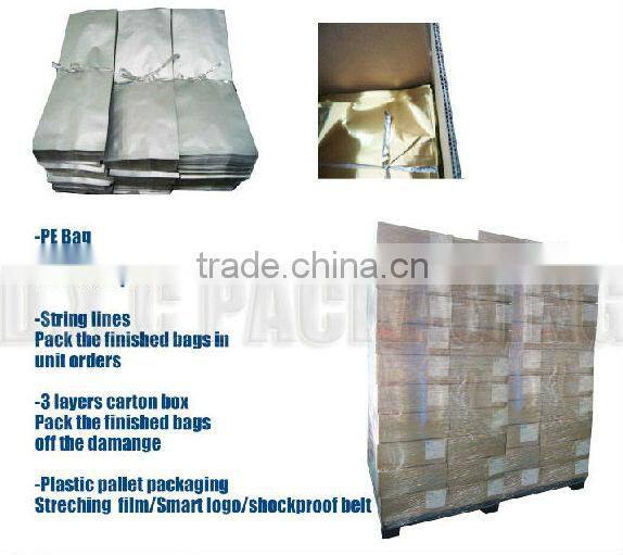 For Heavy volume packaging: Usually for heavy good packaging,capacity :2 KG-15 KG Matt OPP+Kraft Paper+BOPA+PE(kraft paper surface) Pet +ALuminum Foil +BOPA +PE(glossy surface) Matt OPP+ ALuminum Foil +BOPA +PE (matt finished surface) PET+BOPA+PE(without foil layer inside) |