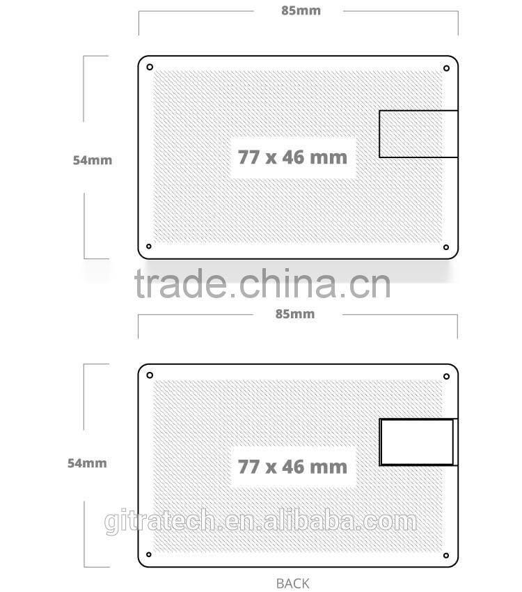 The GTUC010 is our popular aluminum credit-card style drive. This allows you the opportunity to laser etch the brushed aluminum surface, creating a permanent imprint while still taking advantage of the vast expanse of branding area that all of our credit-card style USB drives offer. The GTUC010 is quipped with a micro UDP memory module, maximizing allowable print space.
