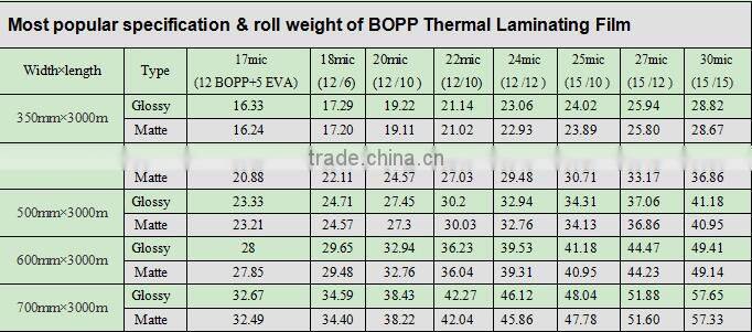 BOPP thermal laminating films are lamination films having BOPP (biaxially oriented polypropylene) as base material. Combine layers of BOPP film and thermal laminating adhesive(EVA). In the final film one side have properties of BOPP film and the other one becomes heat sensitive surface used for dry lamination.