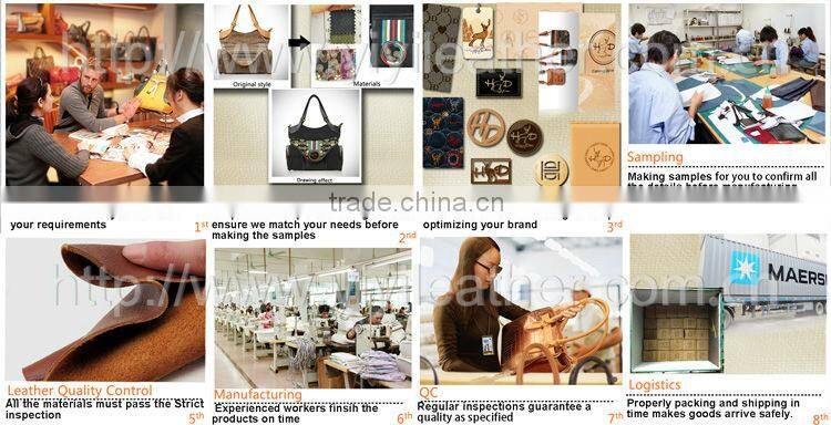 * 2014 hot sale women bags. * Choose top quality Polyurethane leather material. * Light gold hardware * Top with double handles and zip Closure. * Special designed front with a pocket * Cotton lining. * Inside, a zip pocket, an open pocket, and a cell phone holder. * Designed and made in Guangzhou, China. * Accept drop shipping. |