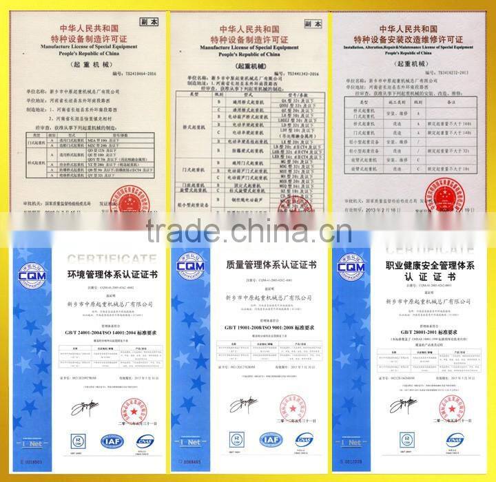 Xinxiang City, Henan Zhongyuan Hoisting Machinery Plant Co., Ltd. was established in 1985, it's crane manufacturer of the Ministry of Machinery Industry of China. Our Co.,Ltd is national grade two measure qualified department and we pass the ISO9001 international certification in 1999. The products are marketing in various industries of mine, building material, chemistry, electric power , communications, railway, olifield and port, etc. We have complete set CAD computer aided design systerm and large datebase; it is capable to undertake the design, manufacture and product development of various special purpose products and non-standard products.