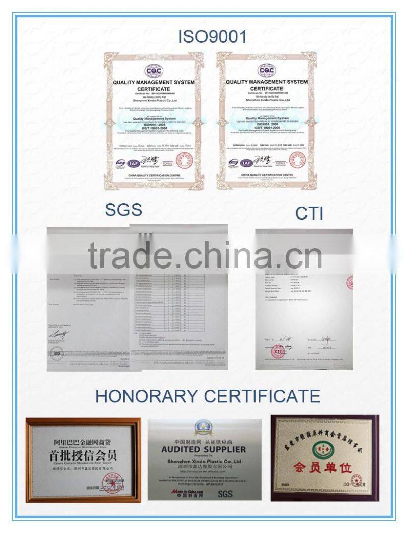 XINDA Plastic has passed ISO9001:2008 Certificate.and our products passed SGS,CTI,FDA certificate.in the past years,our company has get many honorary certificate.such as the gold supplier on alibaba,credit supplier on alibaba.The member of China Plastics Industry Association.Audit supplier in made in China Etc.