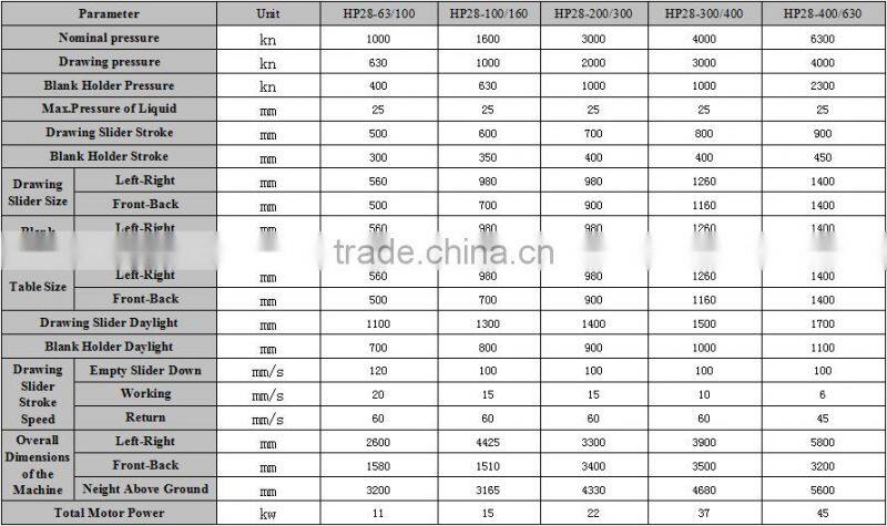 | Nominal Force | Drawing Fora | Blank Holde Force | Max.Pressure of Liquid | Drawing Slider Strock  | Bland Holder Size |