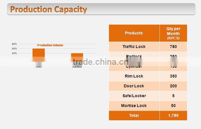 6. Complete product line covering : padlock, cylinder, knob locks, rim locks, mortise locks, motor/bicycle locks, architectural hardware, safe/locker, etc.