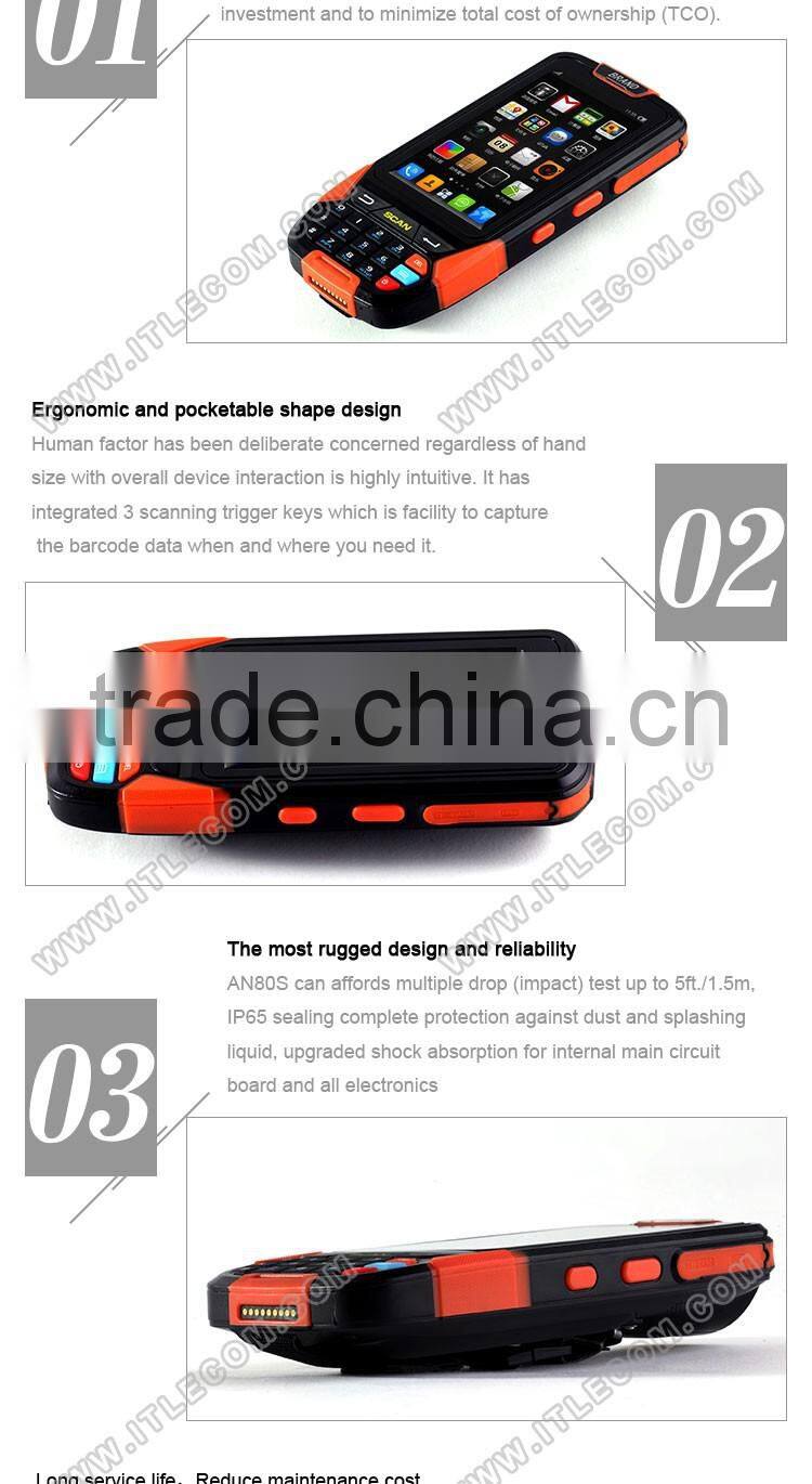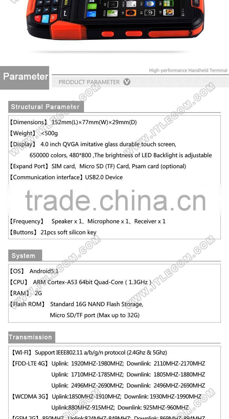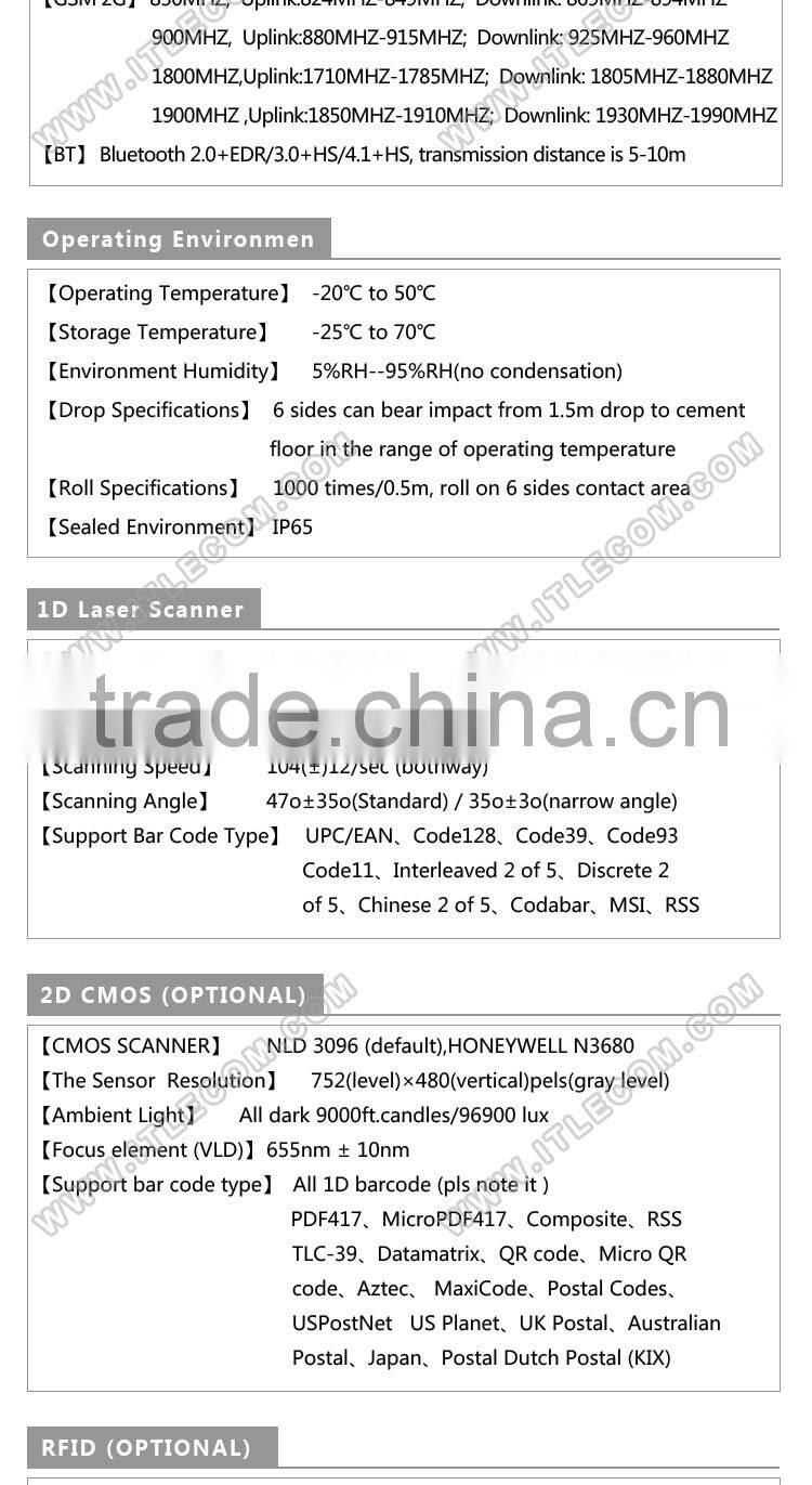 | 1)Default configuration :Wifi+BT+1D+4G FDD-LTE+phone+GPS+8M camera+google player store 2)2D ,NFC ,LF(125K/134.2K),UHF,cradle for option; 3)Compact and Portable Ergonomic Design with wrist strap 4)Safedroid OS (Android 5.1) Highly optimized Android operating system. 5)8.0M mega pixel camera. 6)High capacity 4000mA large capacity battery for critical requirements; 7)Pogo Pin interface for convenient charging with optional charge cradle. 8)Industrial rugged design, water-proof and protection grade(IP65) ; |