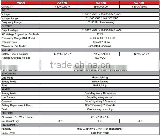 | Output Voltage | 100/110/120/127/220/230VAC+/-10% | Type | Line Interactive | |