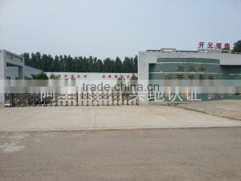Weishi County Xinkaiyuan Garments Co., Ltd. is located in Weishi County of Henan Province , Industrial park Fu Yuan Road No. 16 ,covers an area of 20 acres, is a Hong Kong joint venture, founded in January 2009, a total investment of 30 million yuan, is a set design, production, sales and service as one of the clothing production, trade oriented modern enterprise, existing high speed computer 260 sewing machine, sewing machine 50, advanced equipment and related facilities, the existing staff of 200 people, including senior management and technical personnel more than 30 people, with Taobao, Tmall, Jingdong, Alibaba, enterprise and other 5 mall business platform, professional production of various kinds of thermal underwear, long johns underwear, T-shirt, pants and fashion. After nearly 6 years of hard work, has become a very influential brand in the province's apparel industry. Established from the procurement of raw materials, fabric production to finished product processing, from R & D and manufacturing to online and offline terminal sales, the formation of the norms of the industry chain, the offline products sold in Henan, Hebei, Shandong, Shanxi, Xinjiang, product online is throughout the country, by the user's consistent high praise.