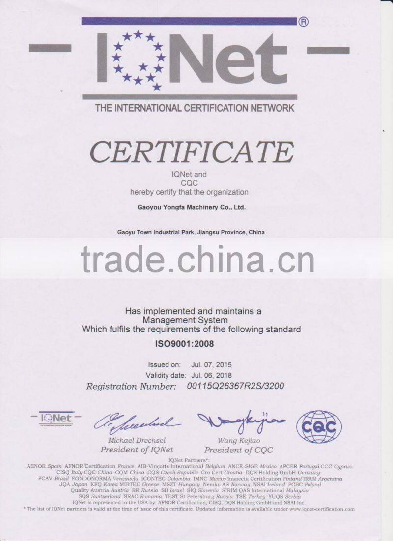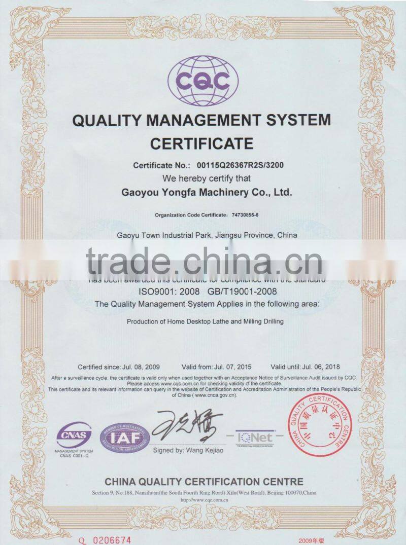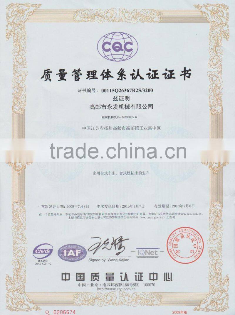 Gaoyou Yongfa Machinery Co., Ltd. is located in the ancient town of Gaoyou City Industrial Park, the plant is favorable geographical position. The company covers an area of over 30,000 square meters, construction area of over 20,000 square meters. More than 380 employees, including more than 50 senior engineers and technicians, with turning, milling, grinding and other metal cutting machinery, testing and other equipment more than 250 sets, and supporting a heat treatment equipment. The main products are bench lathe, milling machine series, machine parts and accessories, power tools and related parts. Products are exported to Europe and America over 50 countries and regions, favored by the users.